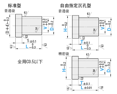 | 精密级型号 | P (P尺寸3以上指定单位0.5mm) | D | H | T 指定单位0.1mm | L 指定单位0.1mm |